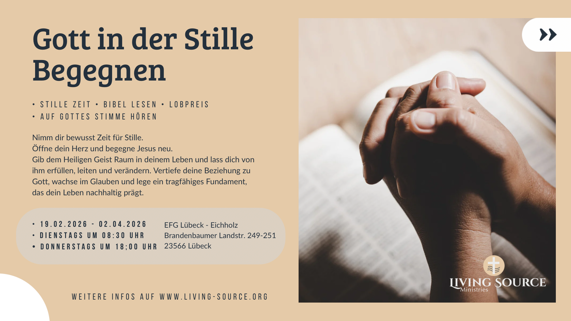 Gebet hat Kraft. Es verbindet uns mit Gott, verändert unsere Herzen und setzt seinen Willen in dieser Welt frei. In unseren Gebetstreffen beten wir für persönliche Anliegen, für unsere Städte, unser Land und für Erweckung in Norddeutschland. Ob stille Fürbitte oder kraftvolles gemeinsames Gebet – wir glauben, dass Gott hört und antwortet.